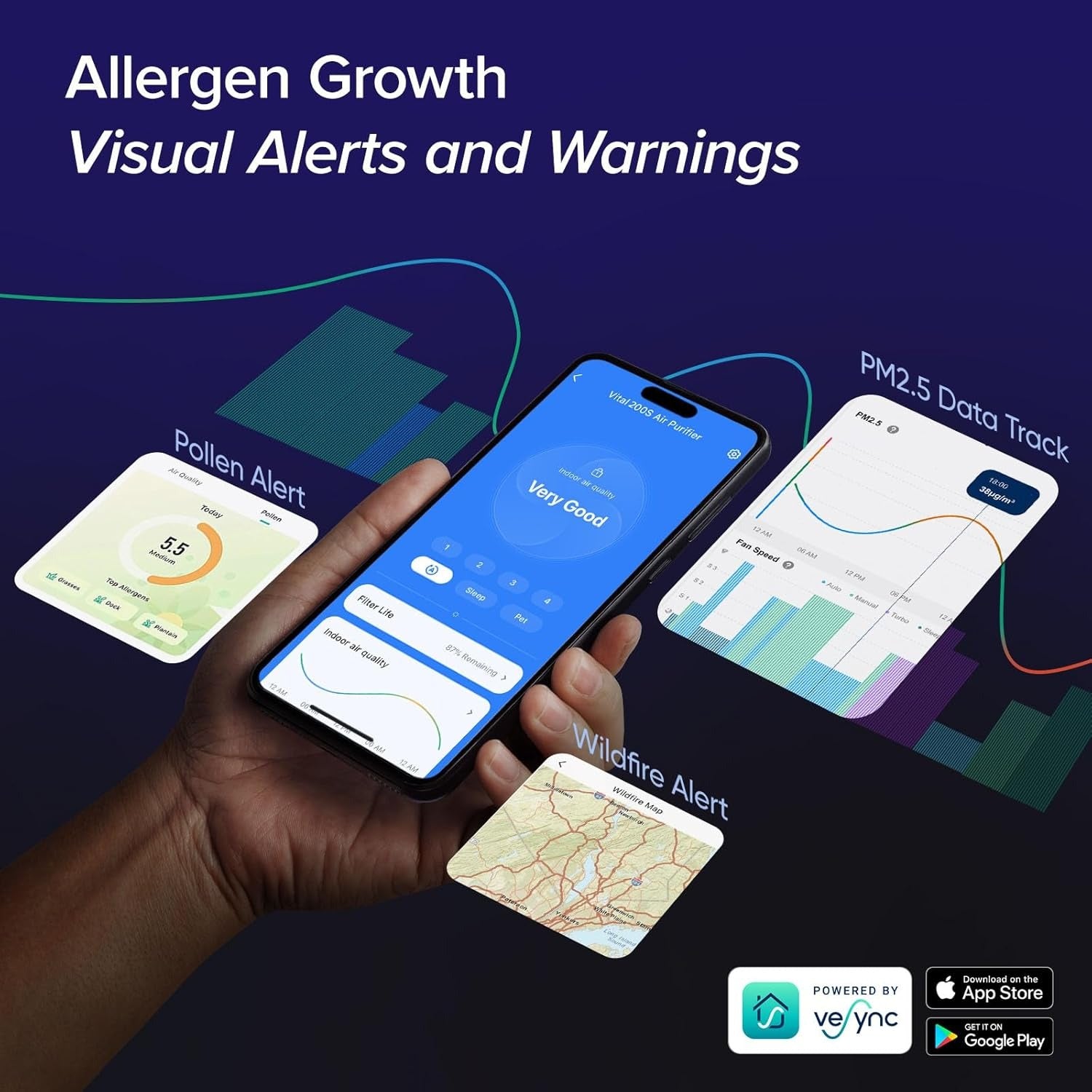 - πππππ πππππππ: With the free VeSync app, you can control air purifier settings, set timers, check filter life, and connect to third-party voice assistants