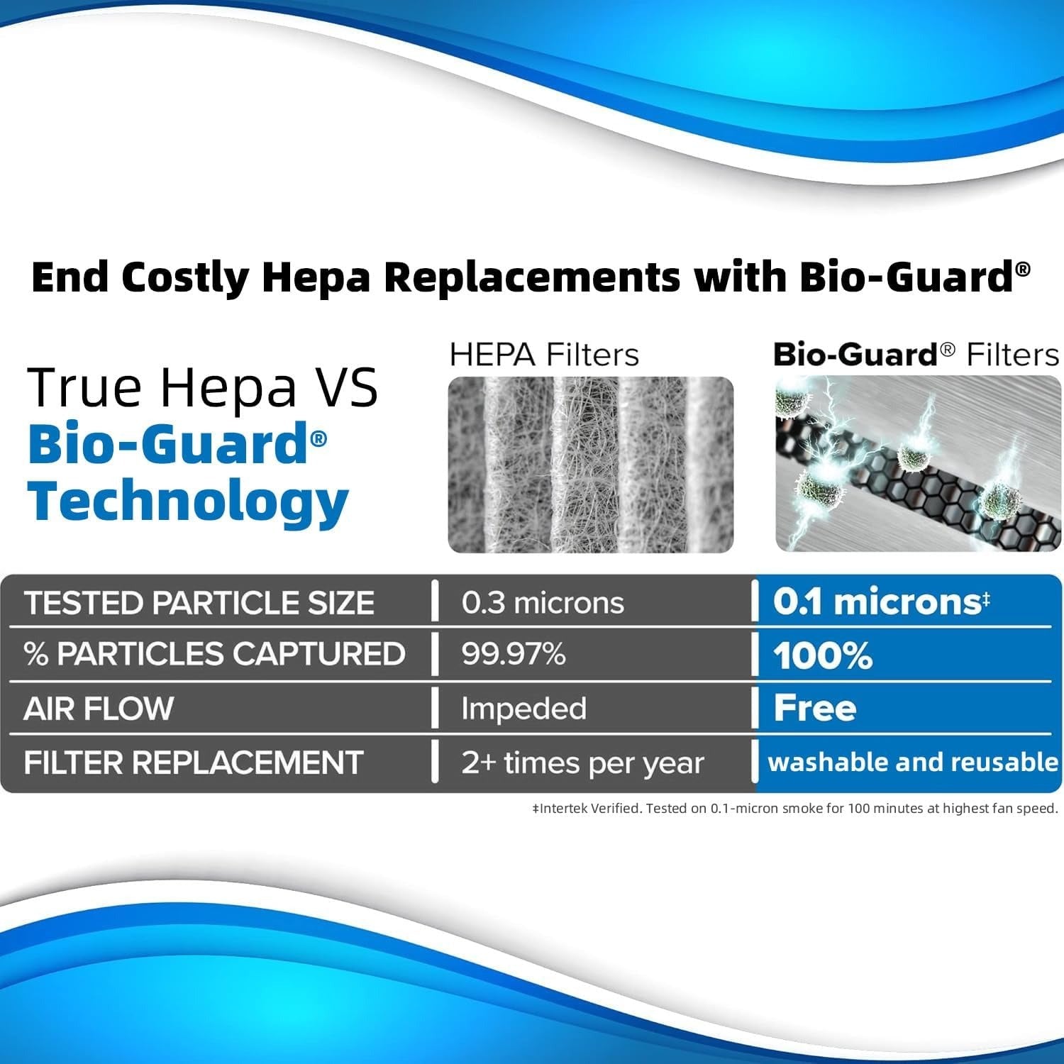• DUAL 3-STAGE FILTERATION โ€“ 2 Stainless-steel prefilter captures large particles. 2 Hi-Tech Bio-Guard Filters & 1 Bio-Guard 360 Filter remove harmful airborne particle pollutants and odors.